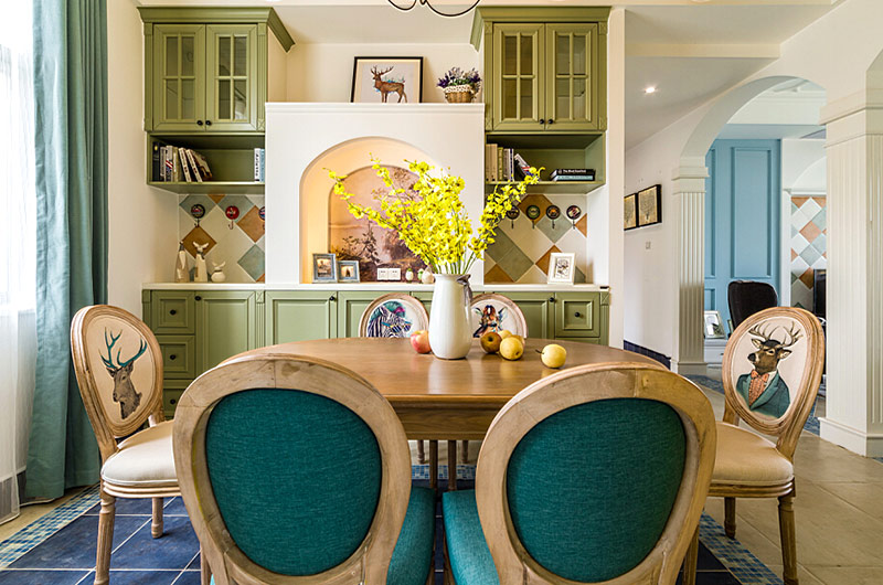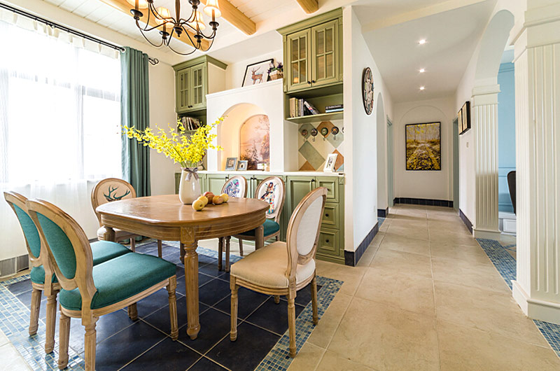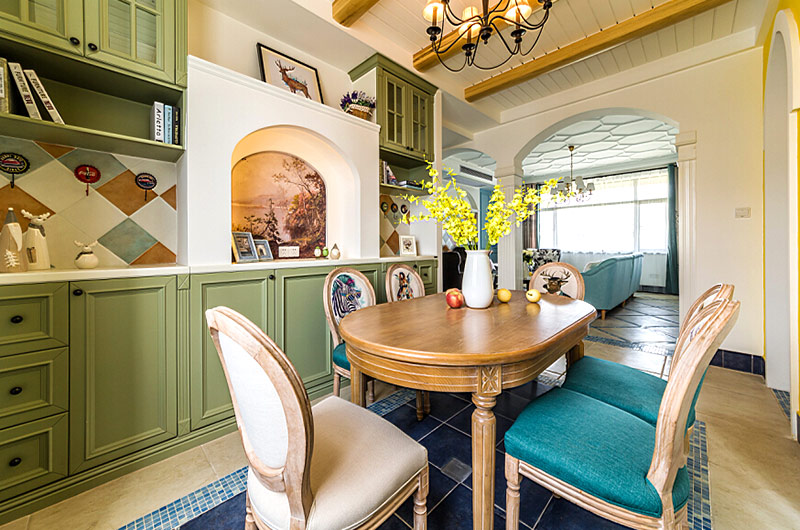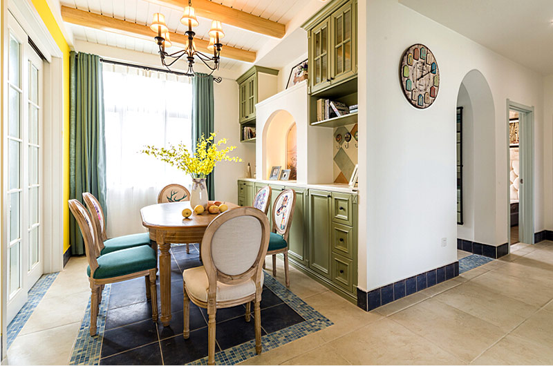 本案中的130平米的三居室整體采用了地中海風(fēng)格裝修,并在清爽愜意的空間氛圍中融入了田園風(fēng)格的清新自然感,在色彩的選擇上也盡量的以清爽的藍(lán)色和富有活力的明黃色為主,并在餐廳中運用了象征著森林的墨綠色,為空間帶來靜謐之感的同時也增添了幾分自然的氣息。同風(fēng)格案例:更多>>