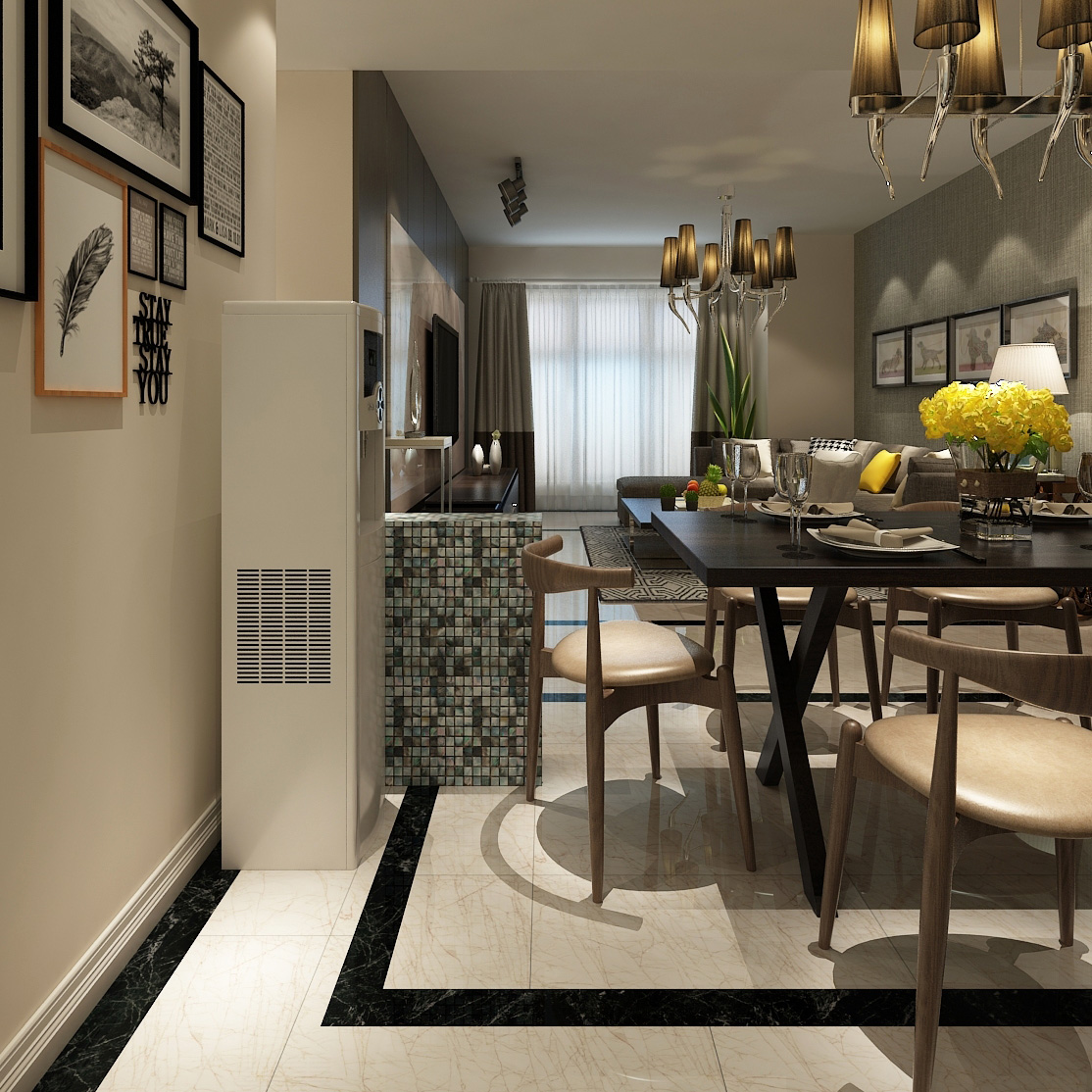 本案中的146平米的三居室整體采用了現代風格裝修,背景墻板與門型采用米白材質,與電視墻外側黑色背景,電視柜桌子、茶幾,形成鮮明對比,輔之灰色點綴,讓整個空間充滿典雅大氣,又不失現代時尚感。燈光多以暖色,給人以溫馨懷抱的暖感,加之白色調相輔相成,營造溫馨的同時又偏于現代生活的明朗。