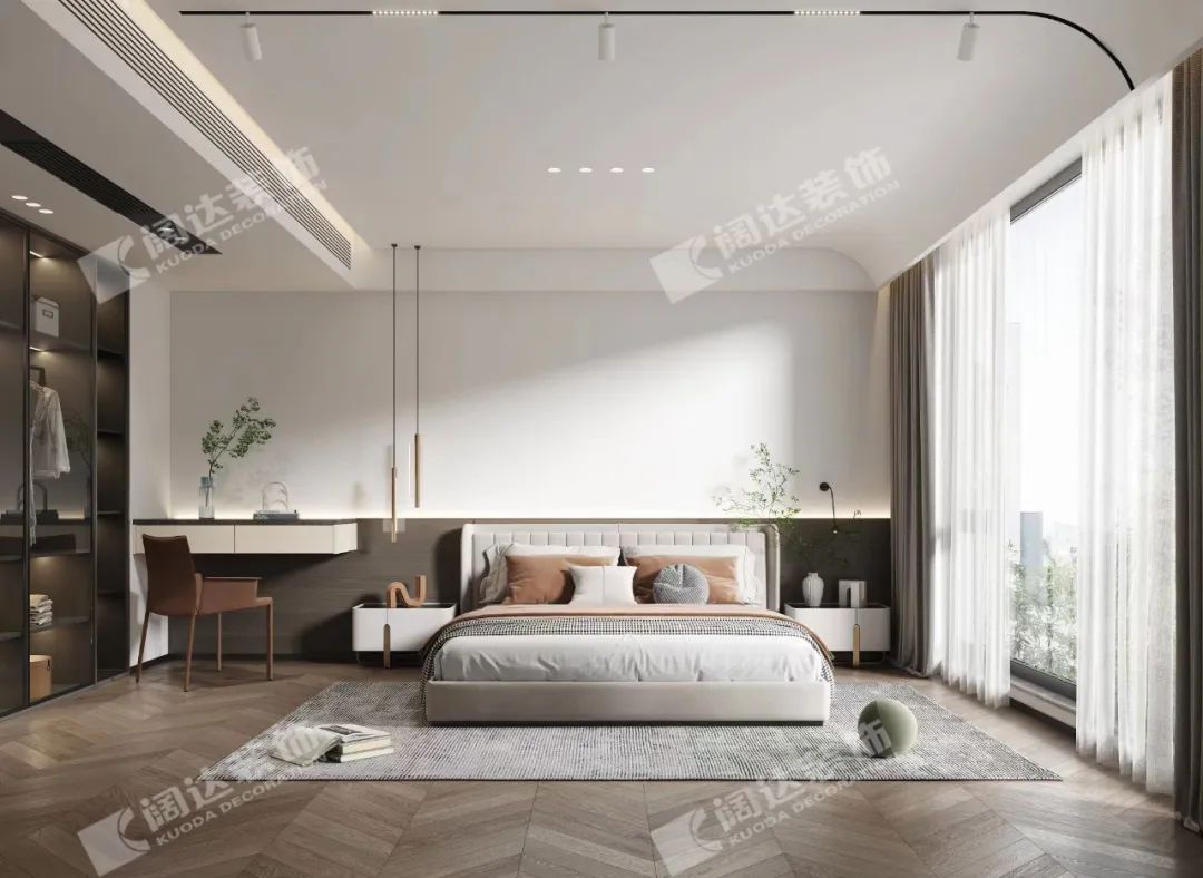 主臥:視覺上的開闊,被光暈染的每個角落,讓人隨心沉浸到自我的空間當中,亮色的家具在白色空間內恰好起到了點綴的妙用。