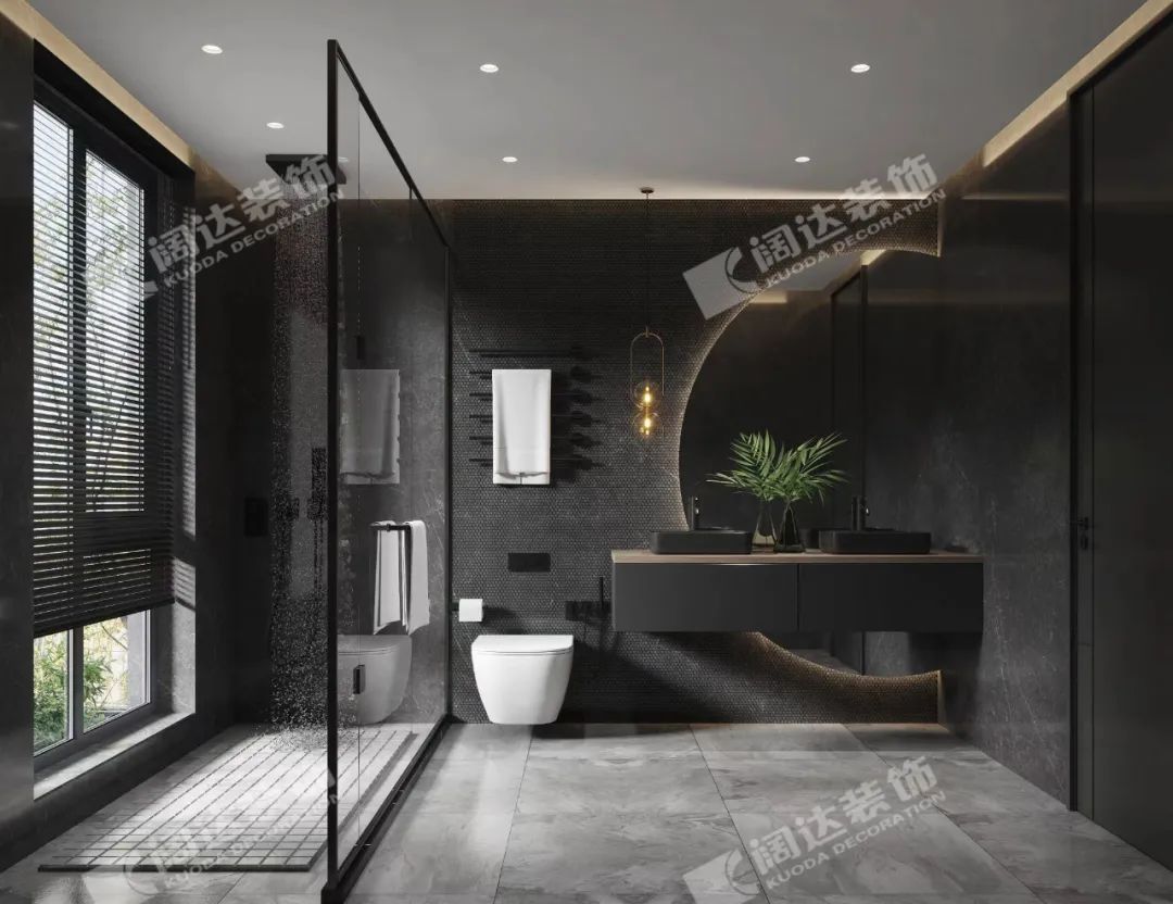 主衛:落地窗引入光線,以光為媒介,在黑色空間交錯、吸引。各式燈光,交織譜寫,跳躍多變。黑色和燈光的相互碰撞,就像我們體內潛藏著兩個靈魂,好似對立,又互相融合。