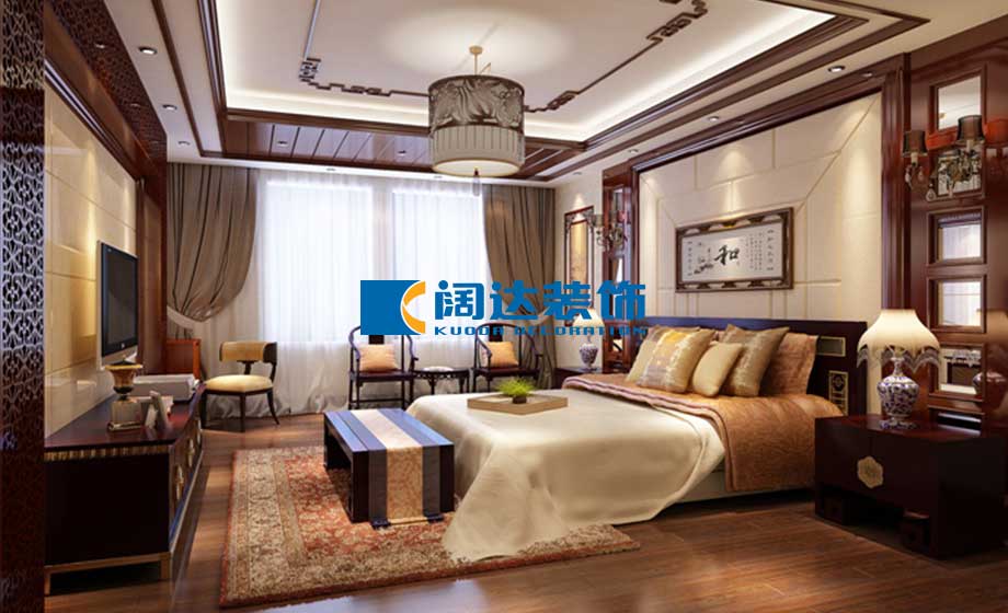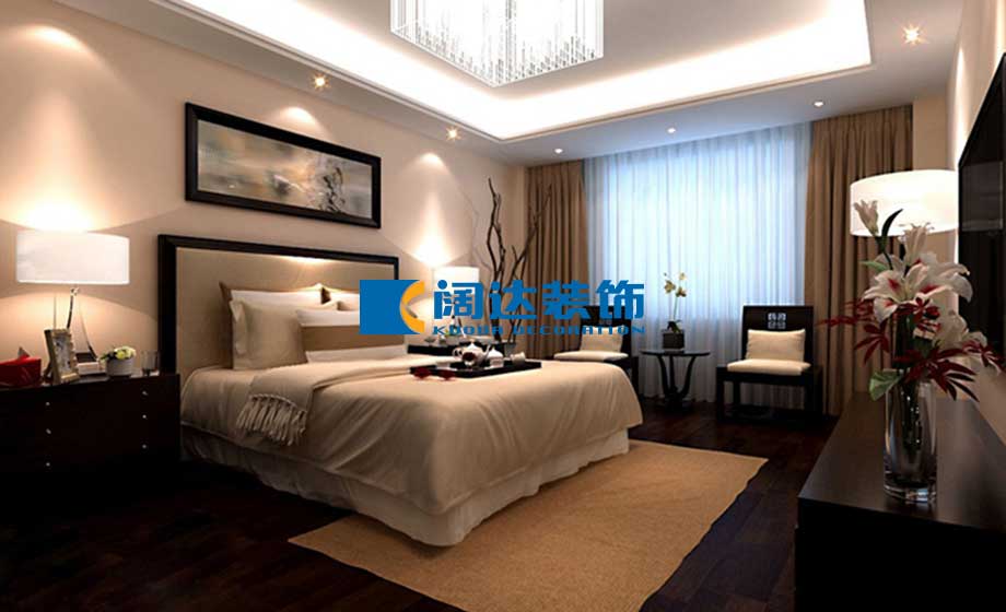 主臥室:本案的主臥室傳承了新中式的風(fēng)格,中式的吊頂和造型床頭背景使的臥室空間充實(shí)著中國(guó)文化氛圍。