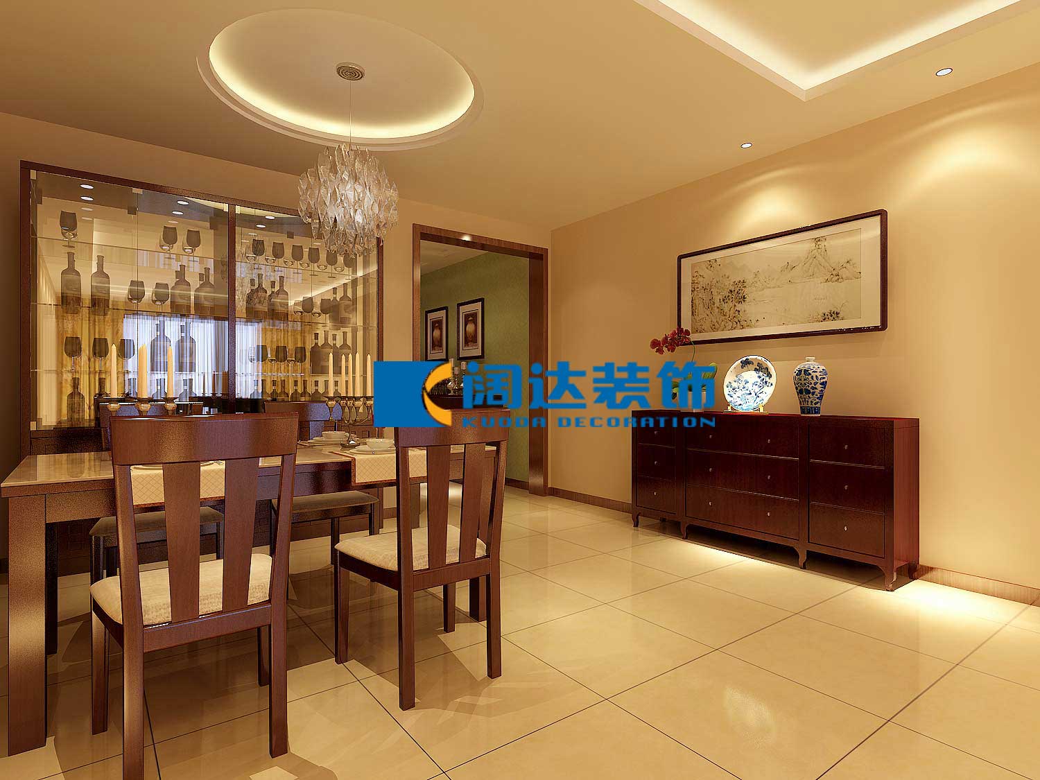 后期搭配窗簾,裝飾品,和水墨畫來增添室內的靈動感和室內整體空間塊體平衡比例的搭配和協調。通過色調,燈具,家具,裝飾品,掛畫等軟裝的設計把業主的品味和生活情趣體現在整個案例里。