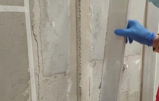 先把攪拌好的材料刮到靠尺上,然后用抹刀將兩邊多余的材料收平,將筋條取掉我們可以看到,石膏未與基層粘結,導致后續筋條空鼓。