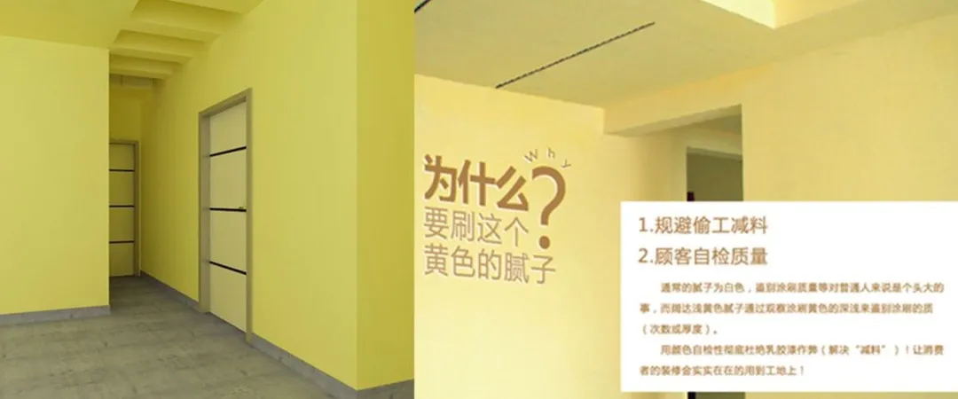 這就是闊達核心施工專利之一,黃色墻面彩襯的由來。下期我來給大家講一講,黃色墻面彩襯是如何實現乳膠漆涂刷的自檢功能的,敬請期待哦~