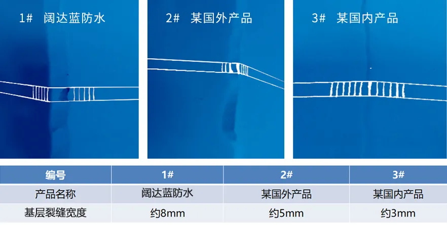 通過上面圖片可以看出,闊達藍防水在8mm縫隙時呈現的韌性,顯然比其他兩種產品分別在5mm和3mm時候的韌性要強。